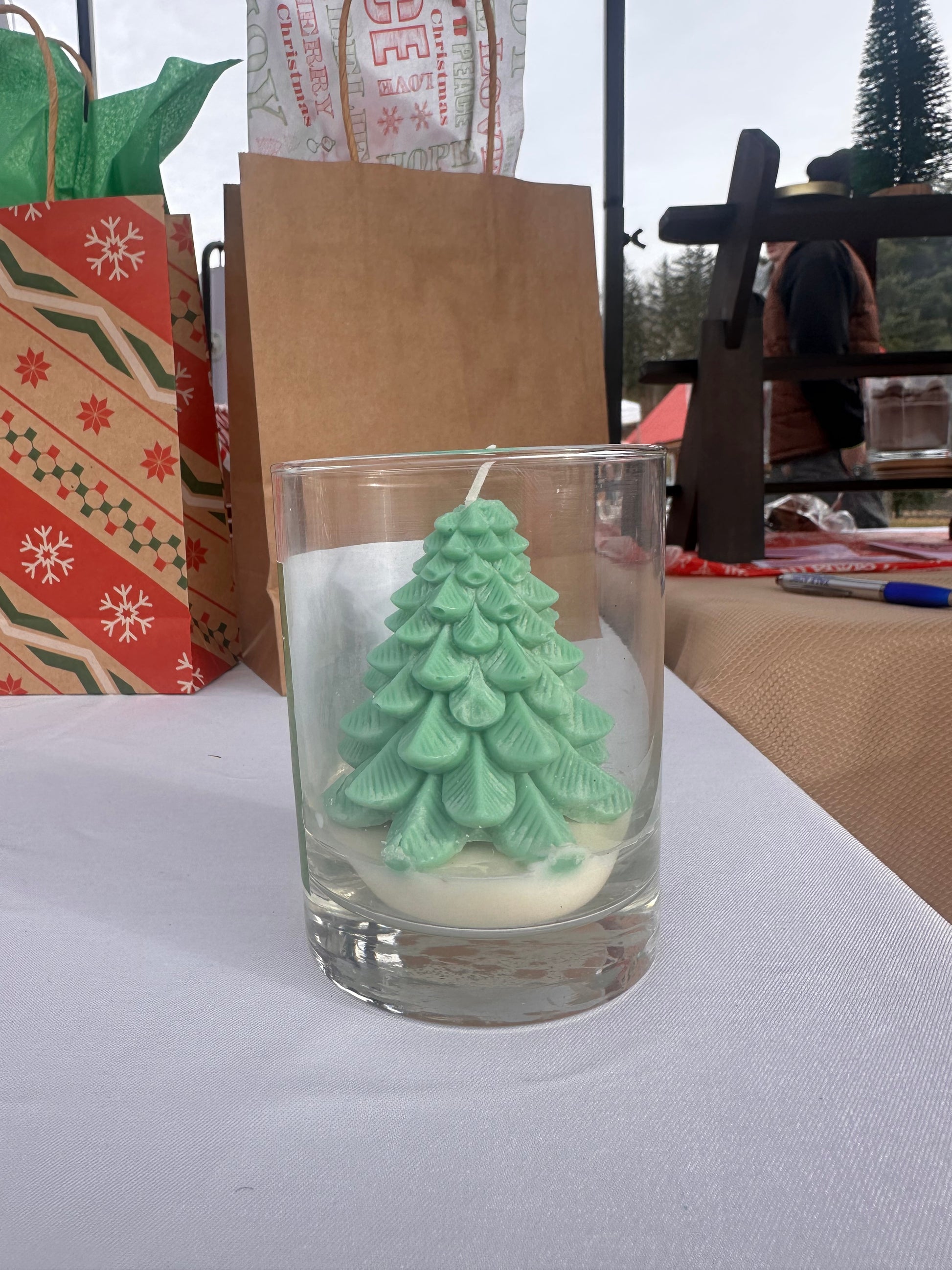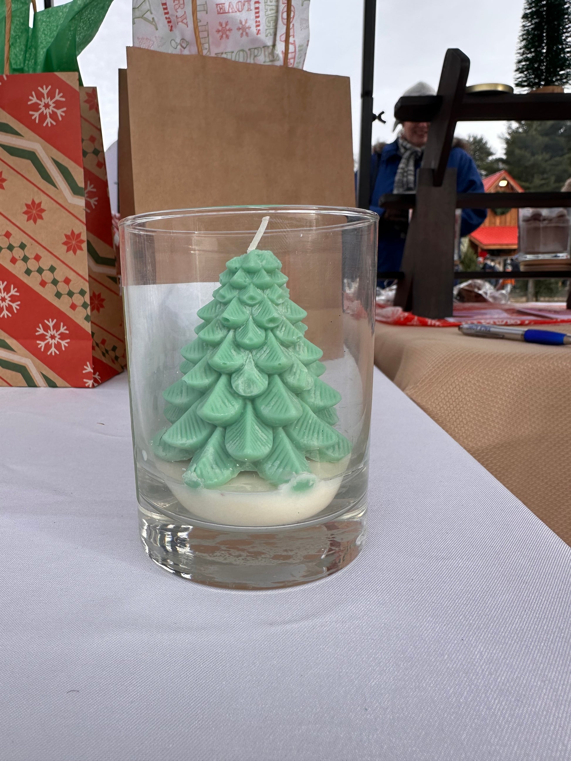 - Hand-poured, sculpted wax Christmas tree design